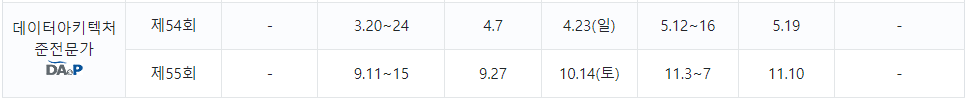 1년에 두 번 밖에 없는 희귀한 시험입니다... 민간자격증이라서 시험을 치루는 사람이 많이 없어서 그런지... 사실 그렇다고 하기엔 데이터아키텍처 전문가 시험인 DAP도 1년에 두 번 밖에 없네요...