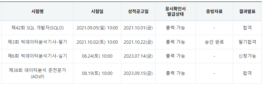 제 시험결과 확인 페이지가 이렇게 완성되었습니다. 그러다 보니 데이터자격검정 홈페이지에 있는 자격증들 중 DAsP만 취득하면 일단 준전문가 자격의 자격증들을 완성할 수 있다는 생각을 하게 되었고, 에라 모르겠다 식으로 시험을 접수하고 말았답니다...!