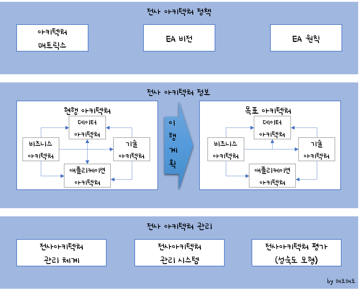 | 전사 아키텍처 관리 | 정의된 전사 아키텍처 정보를 지속해서 유지 관리하고 효과적으로 활용하기 위한 EA 관리 체계의 정립과 EA 관리 시스템의 구축 |
