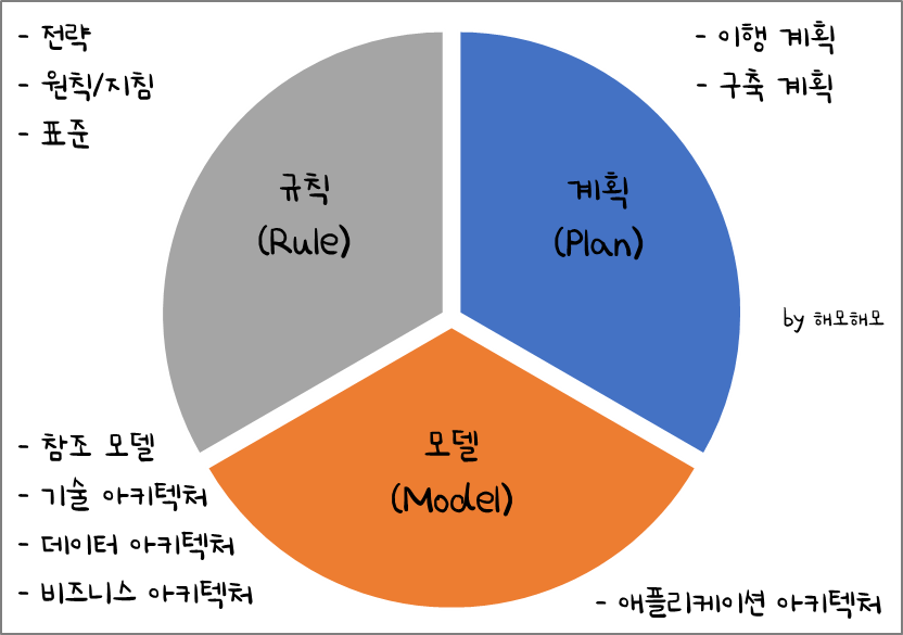 | 모델 | - 비즈니스 아키텍처와 시스템 아키텍처로 구분 - 비즈니스 아키텍처 : 전사 또는 기관의 목표를 달성하기 위한 비즈니스 모델을 바탕으로 함 - 시스템 아키텍처 : 데이터, 애플리케이션, 기술(하드웨어) 등으로 구분 |