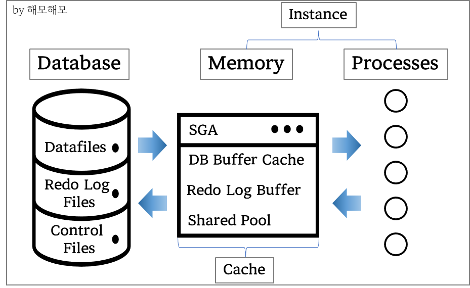 오라클은 데이터베이스와 이를 액세스하는 프로세스 사이에 SGA(System Gloval Area 또는 Shared Global Area)라고 하는 메모리 캐시 영역을 두고 있다.