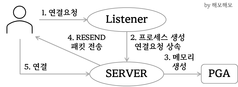 리스너에 연결요청을 하는 순간 하나의 프로세스를 띄우고(fork) PGA(Process=Program=Private) 메모리를 할당