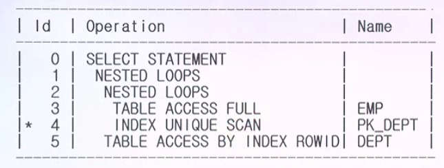 SELECT A.ENAME, A.DEPTNO, B.DNAME FROM EMP A, DEPT B WHERE A.DEPTNO = B.DEPTNO; OPTIMIZER: SQL해석 > 실행계획 수립 > 실행