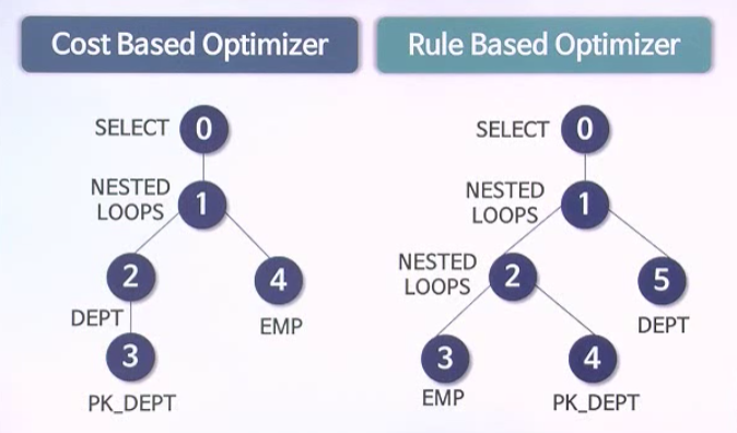 - 동일 SQL에 대해서 각 옵티마이저가 수립한 실행계획은 서로 다를 수 있음