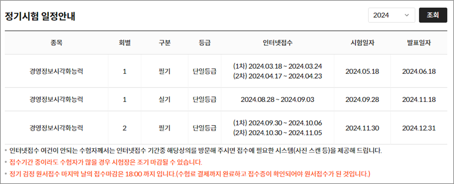 따끈따끈하게 2024년 처음 시행되는 경영정보시각화능력 시험은 2024년에 필기 2번, 실기 1번 시행되네요.