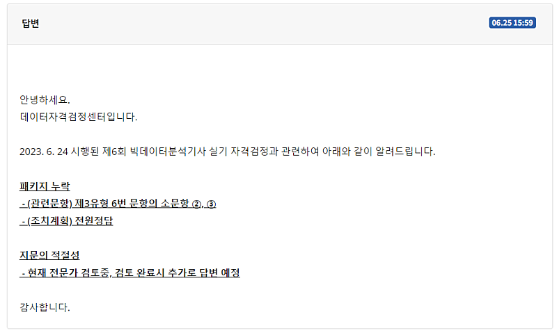 데이터자격검정센터에서의 빅데이터분석기사 6회 실기 관련 공지사항