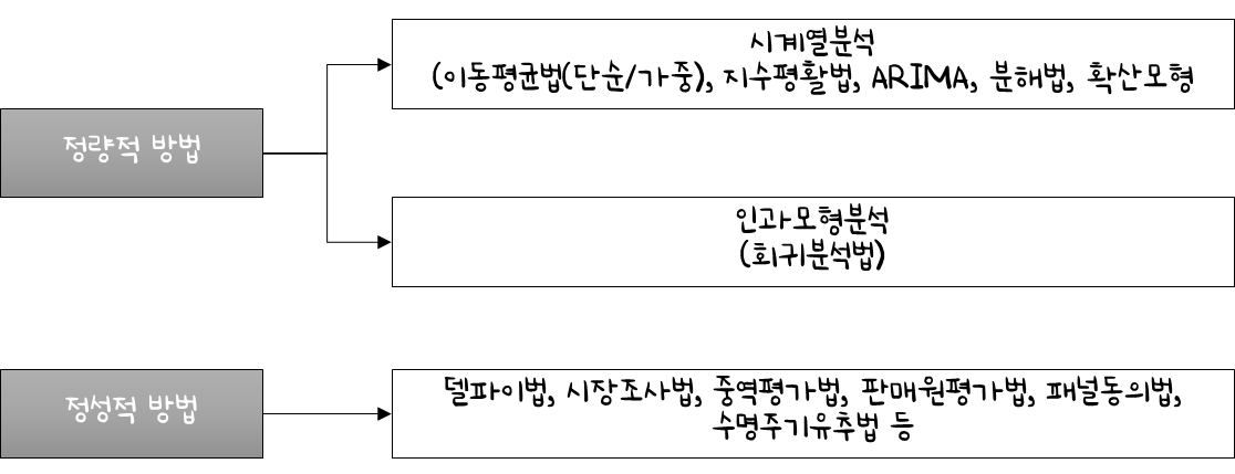 수요예측 : 재화나 서비스에 대하여 일정 기간 동안에 발생할 가능성이 있는 모든 수요(잠재+현재(유효)수요)의 규모를 추정하는 것