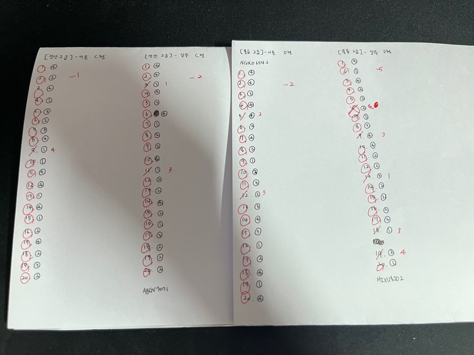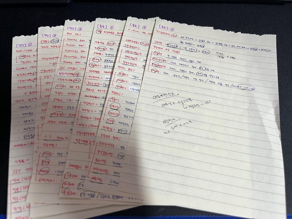 저는 시험 전날 제가 틀렸던 문제를 중심으로 간단한 계산식이나 개념 등을 메모해서 시험장에 갔었고, 1교시 생산2급 입실을 기다리는 시간까지 생산 2급 메모를 계속 암기했습니다...