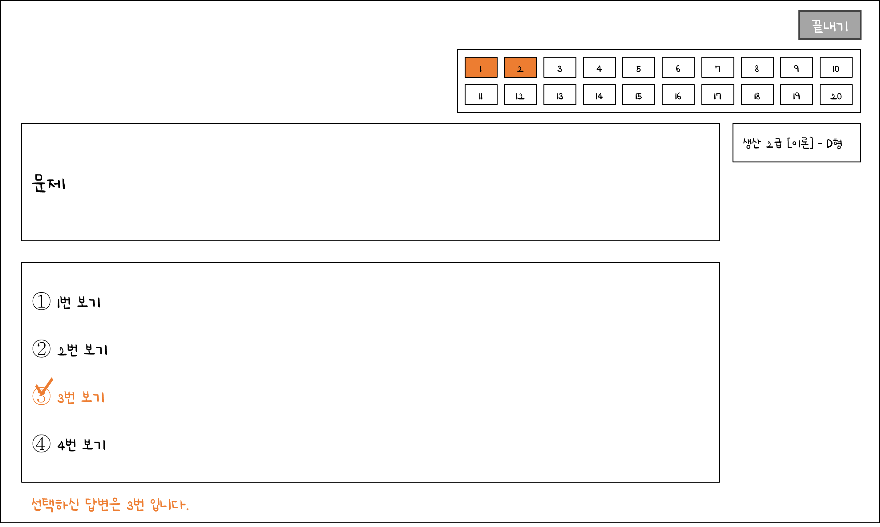 우측 상단에는 문제번호가 적혀 있으며, 번호 클릭 시 해당 문제로 넘어갑니다. 또한 답변을 체크한 문제는 위 그림처럼 색이 칠해집니다.