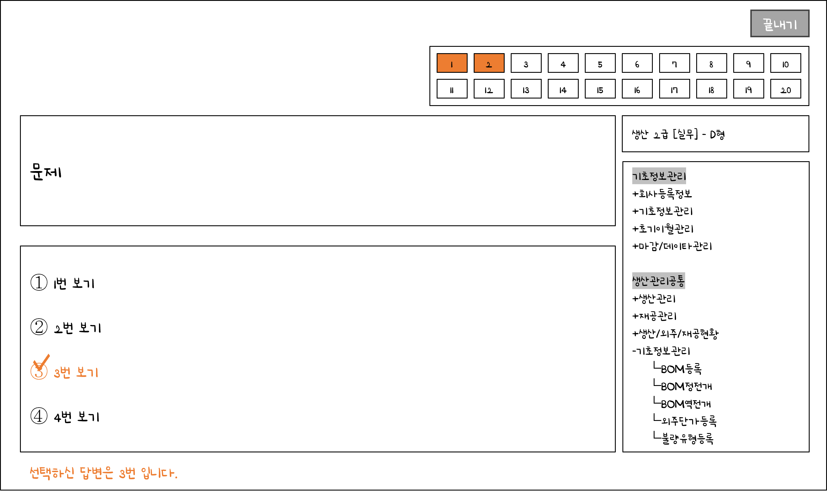 문제를 다 풀면 모든 문제번호에 색이 칠해지고, [끝내기]를 클릭해서 저장 후 제출이 되어서 ERP프로그램이 종료되더라도, 시험시간 중에는 언제던지 다시 ERP프로그램을 실행시켜 답변을 수정하거나 할 수 있습니다.