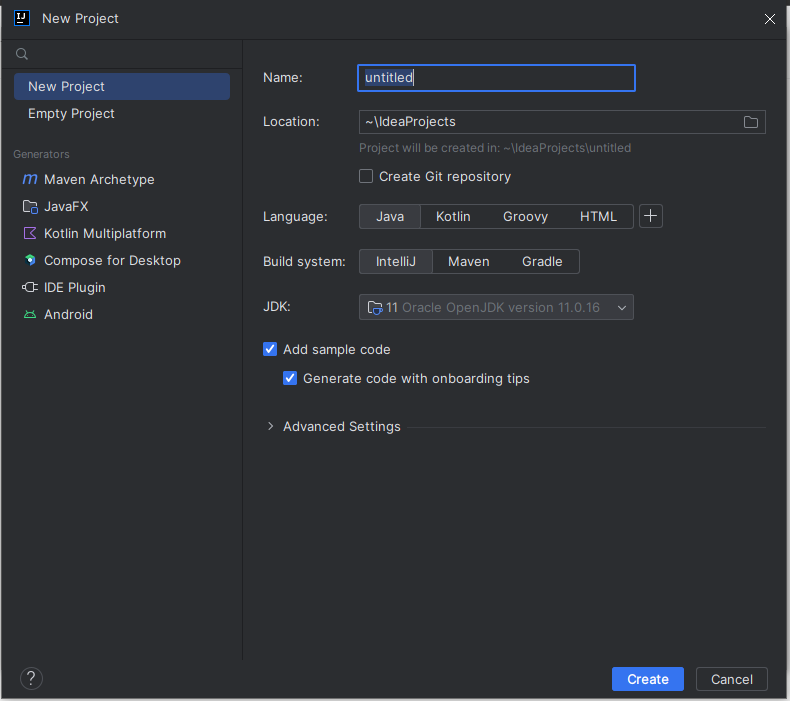 프로젝트 생성 버튼을 누르면 아래 이미지처럼 설정하는 화면이 나타납니다.