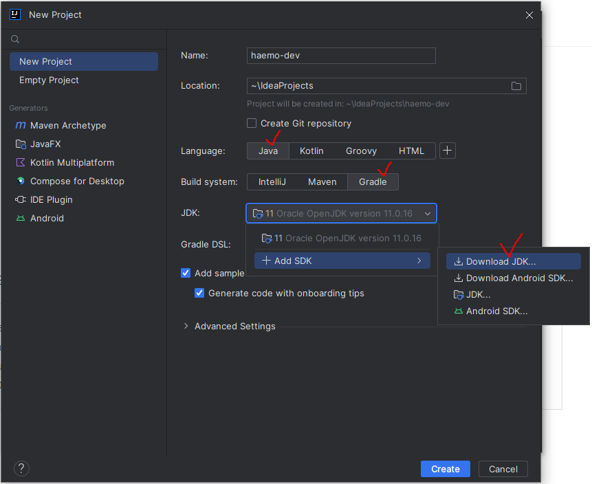 이번 프로젝트에서는 JDK은 17, 언어는 Java, 프로젝트 유형은 Gradle(그레이들)로 설정하려고 합니다.