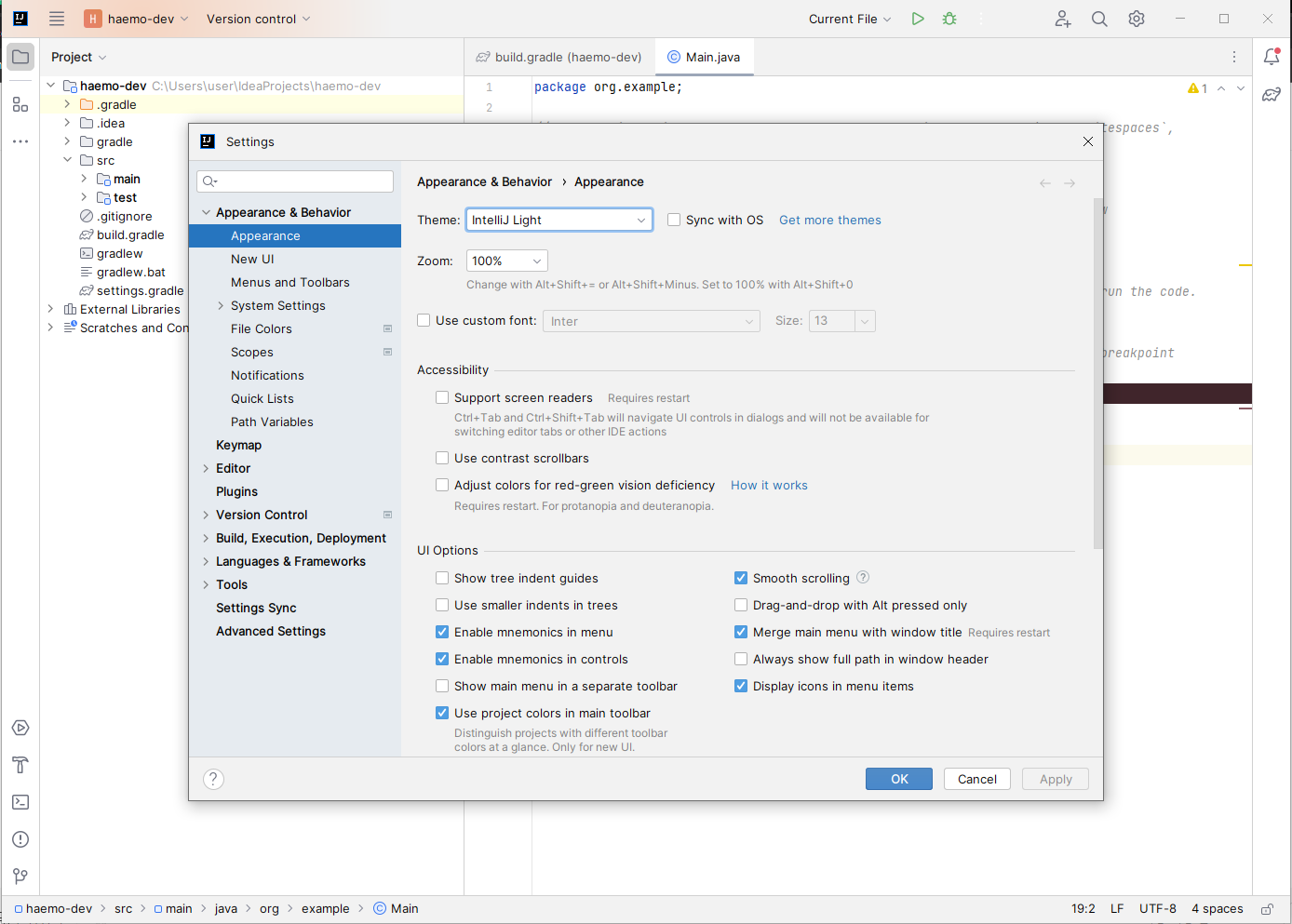 Settings 메뉴에서 바로 Theme 화면을 발견할 수 있습니다. 저는 IntelliJ Light로 변경해보겠습니다.