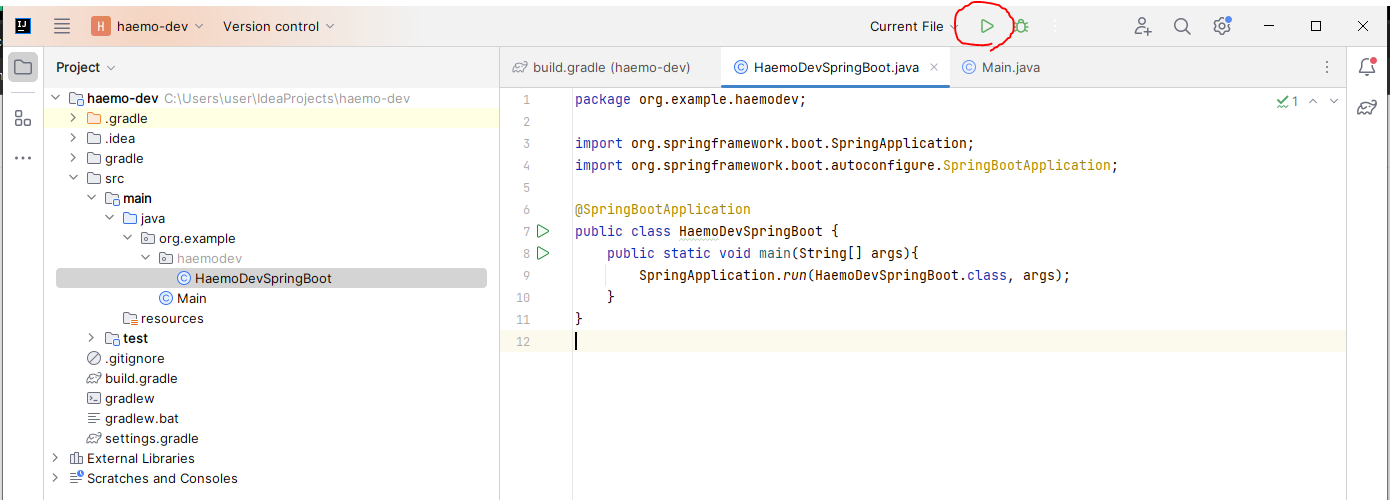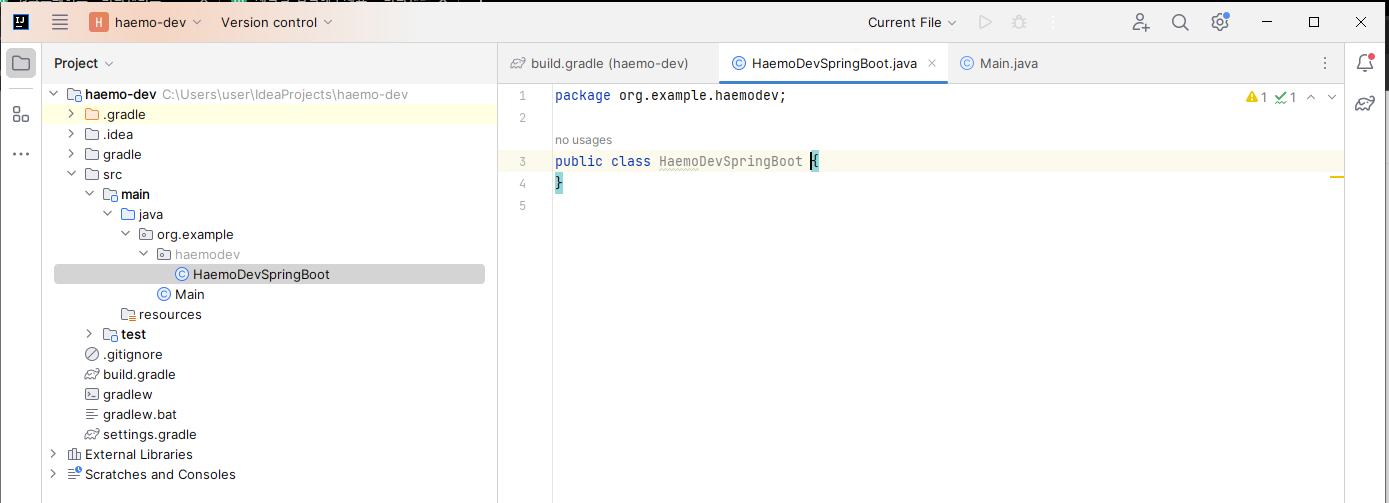 클래스명은 자유롭게 지어도 됩니다. 기본적으로는 [프로젝트이름][Application]을 합쳐서 만드는 것 같습니다만, 저는 [HaemoDevSpringBoot]라고 만들어보고자 합니다. 클래스명 입력 후 엔터를 클릭하면 아래 이미지처럼 텅텅 빈 귀여운 java 파일이 만들어집니다.