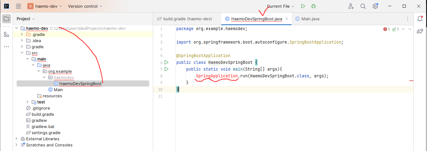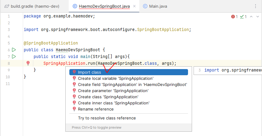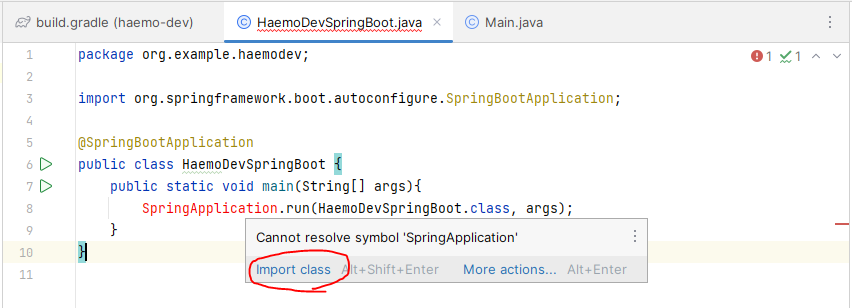 Import class를 완료하면 빨간줄 에러가 사라지고, SpringApplication의 빨간 글씨가 검정 글씨로 변하면서