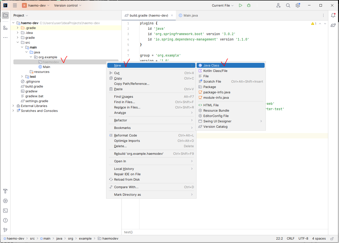 이제 패키지에 스프링 부트를 실행할 용도의 클래스를 만들어야 합니다. 방금 생성한 패키지를 우클릭 한 다음 New > Java Class를 클릭합니다.