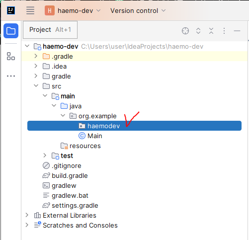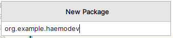 패키지 이름은 [그룹이름.프로젝트이름] 이런 식으로 만들게 됩니다. 저는 그룹이름(org.example)과 프로젝트 이름(haemodev)을 입력하여 새 패키지를 만들도록 하겠습니다.