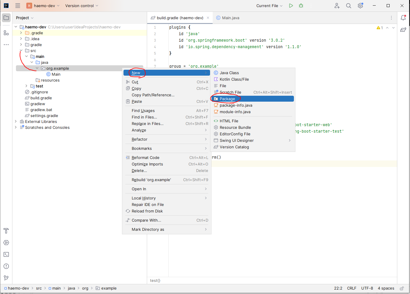 새 패키지는 좌측 메뉴에서 src > main > java를 펼친 다음, 미리 생성된 패키지인 org.example을 마우스 우클릭 해 New > Package를 선택하여 만들 수 있습니다.