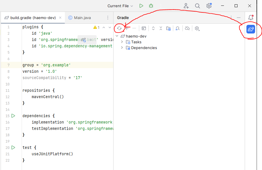 우측 바에 있는 코끼리 모양의 Gradle 클릭 후 새로고침 버튼을 클릭합니다.
